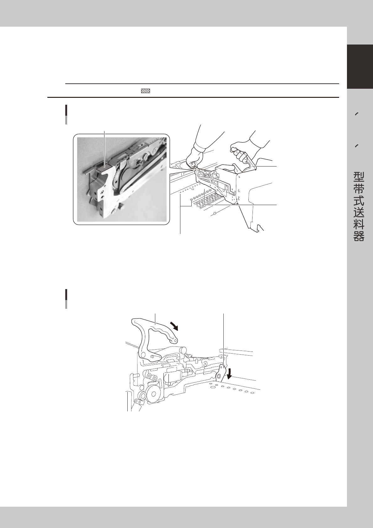 1-1 1 1 FS FS2 FT (8mm) 3 安装送料器机体。 在提起锁定杆固定把手的状态下, 握住送料器的前端和把手, 将送料器从正上方水平地安装在送料器架上。 送料器架上设有插入送料器机体前侧定位销和后侧定位销的定位孔。务必将送料器的定位销完全插入定位 孔中。 c 注意 按压送料器的前端时,务必按压下图所示 部分。如压其它部分,前侧的压杆将会解除锁定状态。 30 18 19 20 21 22 23 24 25 26 27 2…