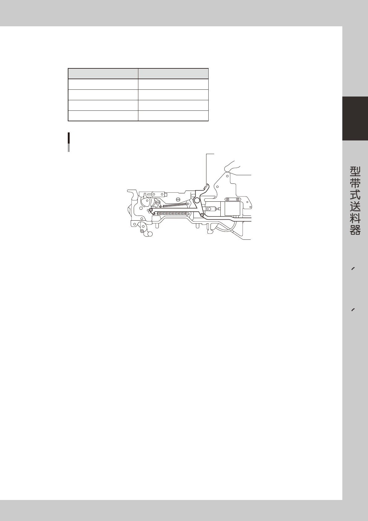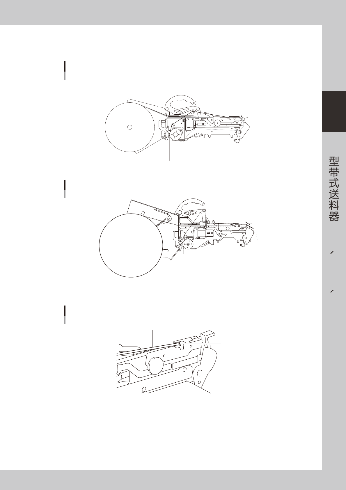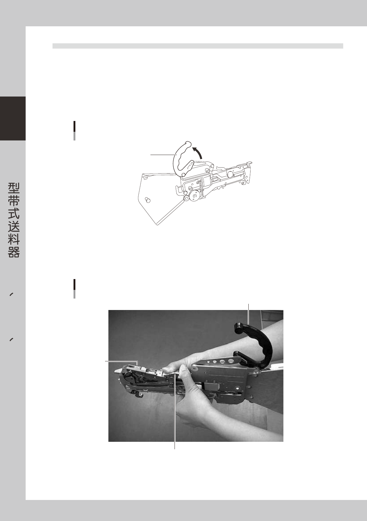 2-4 2 CL (8mm 12mm 16mm) 2.2 料带的安装 按照下列步骤,将料带装入带式送料器。 1 剥离盖带。 料带由装有电子元件的「基带」和覆盖在元件上面的「盖带」2 层组成,先剥离「盖带」 。 2 提起锁定杆固定把手。 要提起料带导轨,必须先提起锁定杆固定把手。 锁定杆固定把手 锁定杆固定把手 65204-90-00 3 提起料带导轨。 按住手动杆提起料带导轨。  提起料带导轨后,将手动杆放松,使料带导轨保持提起状态…
