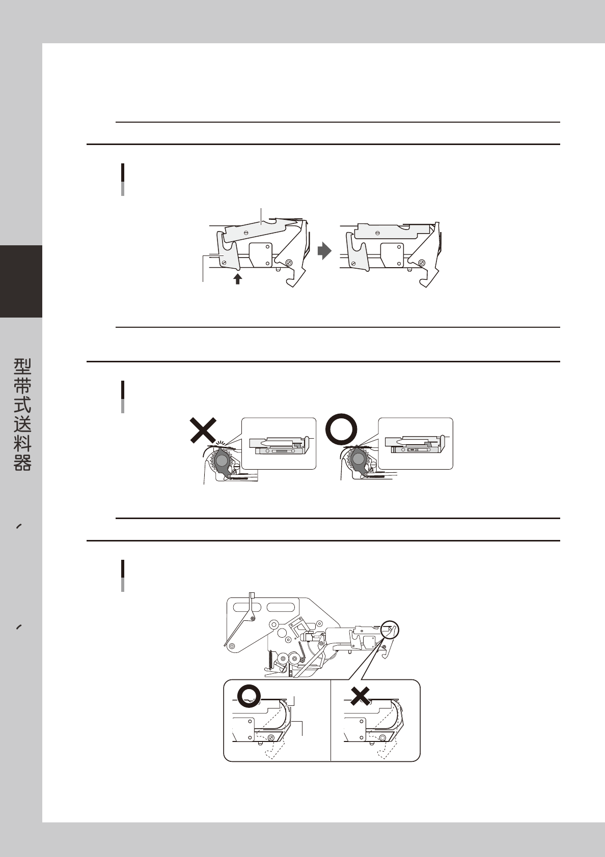 如滑板开关在后侧状态 ( 打开状态 ) 放下料带导轨,驱动滑板开关用把手会碰到滑板而使其变形。如滑板变形会引起动态阻力增大,