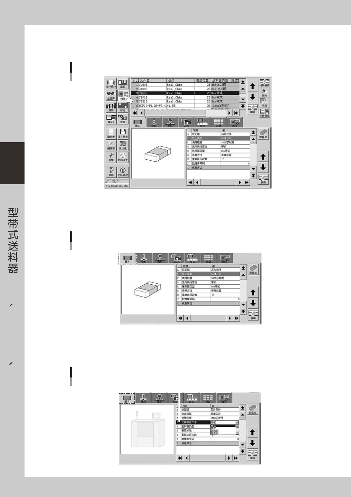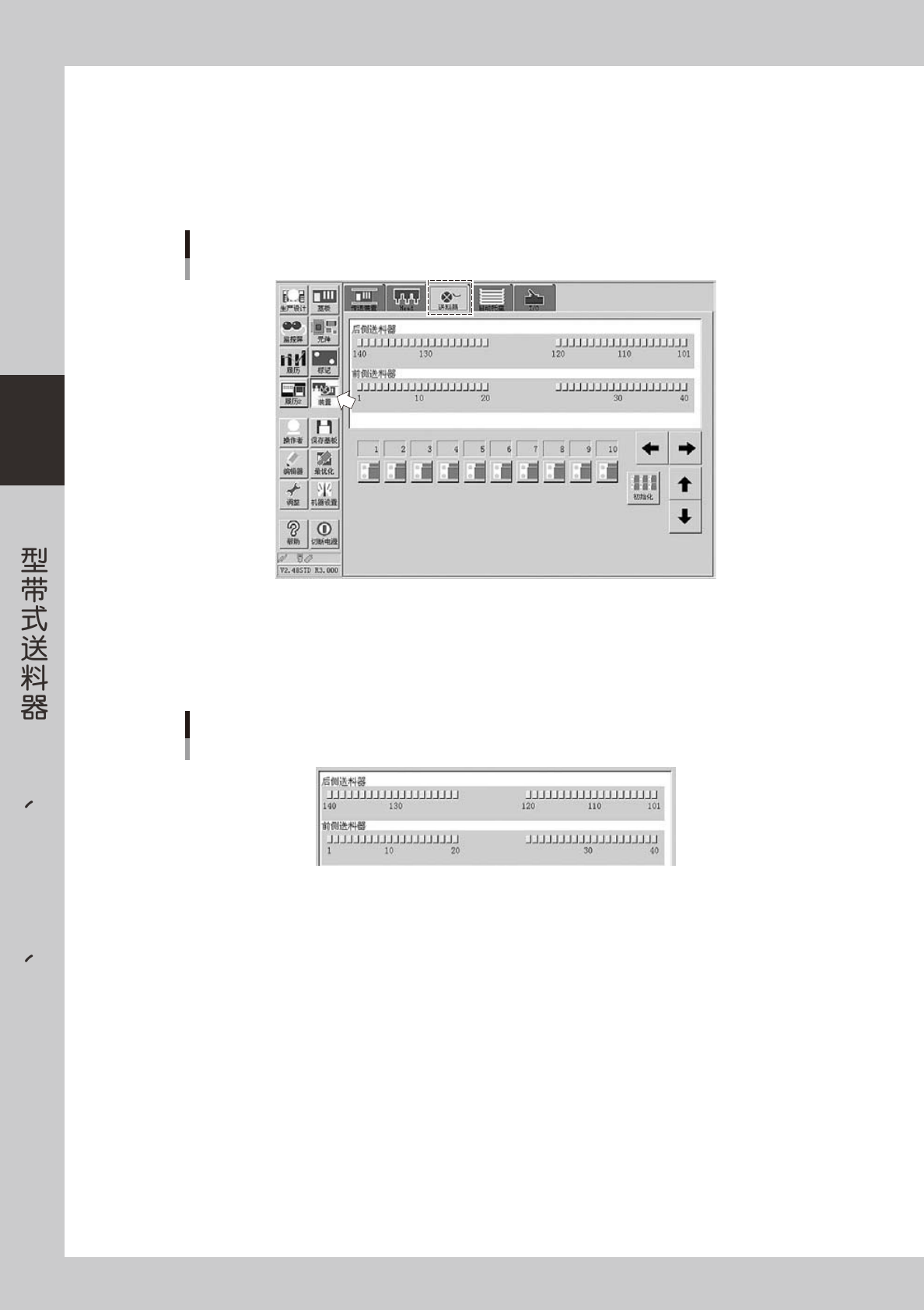 点击「装置」按钮选择「送料器」选项卡,打开送料器画面。