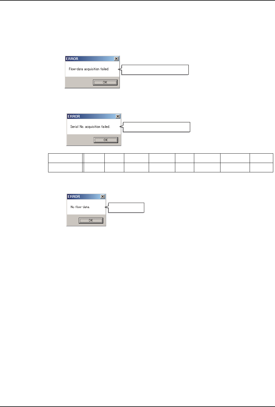 INS-HDCLN-002S0 8. 数据管理 工作头自动清洗机使用说明书 75 关于操作中的错误 有可能无法获取数据,而显示错 误信息。请对照错误内容,进行确认作业。 a. 显示以下的信息时,请正确地连接 PC 和工作头自动 清洗机,然后重新启动工作头自 动清洗机。 b. 显示以下的信息时,表示清洗的贴 装工作头没有对应本工具。请在 「S/N」栏所显示 的序列号中,确认对应工作头。 c. 显示以下的信息时,表示不存在结 果数据。请完成…