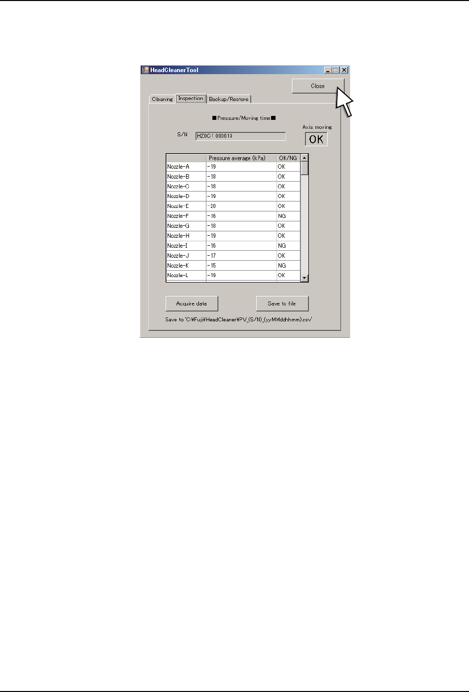 INS-HDCLN-002S0 8. 数据管理 工作头自动清洗机使用说明书 81 8.2.6 结束 HeadCleanerTool 请点击 「Cl ose」按钮。 01NST -2649