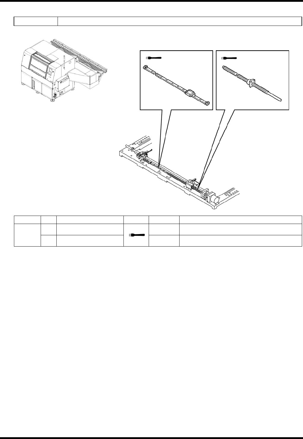 RL132 维修手册 7.3 基板搬送部 DA9MCC-Z4-000-A0 7.3-4 7.3.4 销自动宽度调整装置部(选购件) Unit No. N610054629 AA Oiling 周期 No. 项目 作业 加油量 详细内容 1. 滚珠丝杠 1 cm 3 位置 : 螺纹 3 个月 2. LM 导轨 0.5 cm 3 位置 : 轨道表面 1. 滚珠丝杠 2. LM 导轨