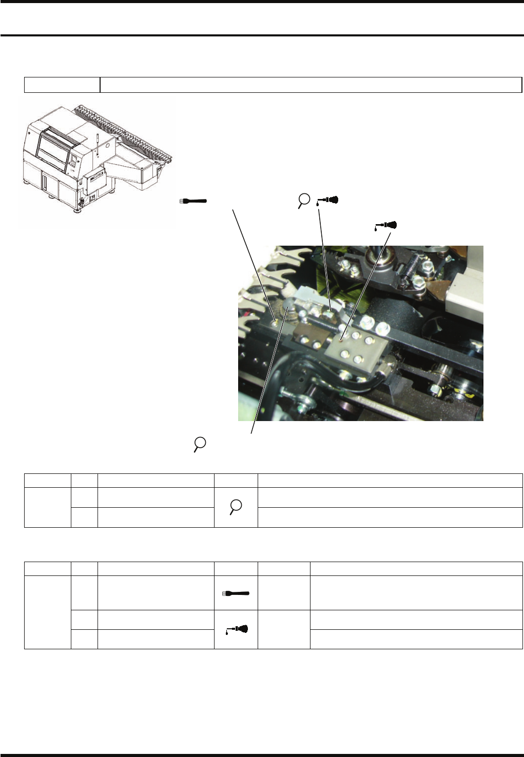 RL132 维修手册 7.6 元件加工部方面 DA9MCC-Z1-L00-A0 7.6-2 7.6.2 元件主体修正部 (选购件) 装置编号 N610125686AA 加油 周期 No. 项目 作业 加油量 详细内容 1. LM 导轨 2. 凸轮从动件 3. 开闭销 4. 挂钩 0.5 cm 3 彻底擦净粘付在表面上的灰尘后, 薄薄地 涂上 润滑脂。 每周 5. 加油孔 1 至 2 滴 向加油孔加油 1 ~ 2 滴。 1. LM 导…