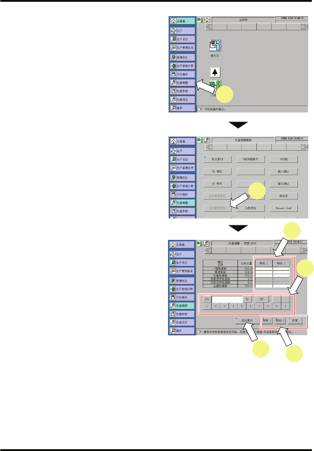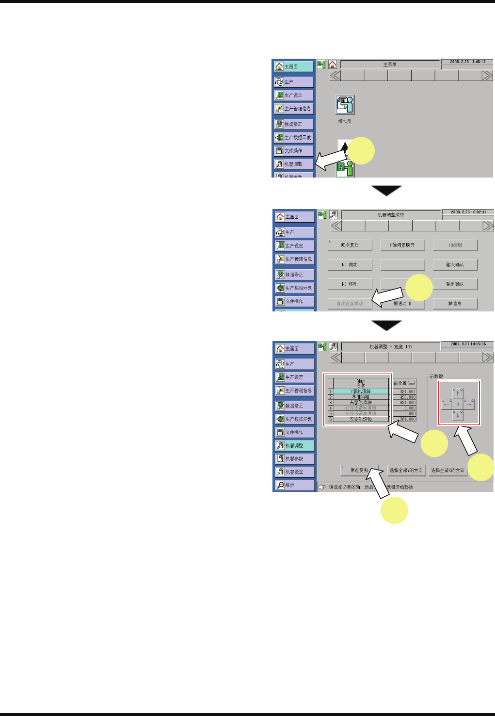 RL132 维修手册 9.1 移动检查 DA9MCC-71-010-A0 9.1-6 9.1.4 宽度调整轴微动 ( 选购件 ) 在动作检查中使各轴动作之前,请将 所有的轴都返回原点之后,再使 各轴动作。 4. 1. 按下主菜单的 [ 机器调整 ] 按钮。 显示 “ 机器调整菜单 ” 画面。 = 注意 = 要使 θ H 轴进行 JOG 动作时, 必须要有以下的步骤。 1. IO 控制 2. 请按下移交头的返回键,使移交夹头 装置向右…
