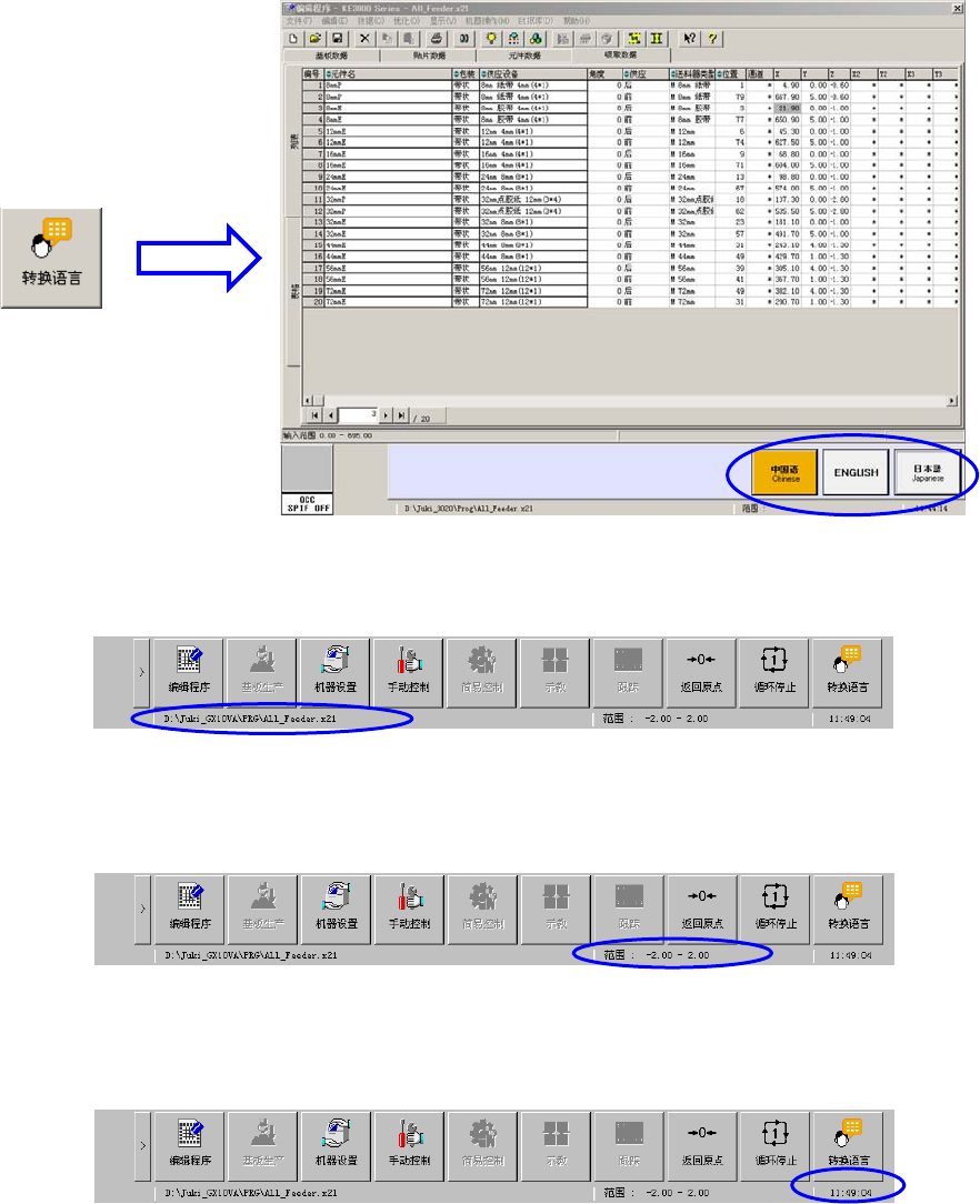 第 1 部 基本篇 第 1 章 装置概要 1-93 语言切换按钮 : 按下 [ 转换语言 ] 按钮后,可显示转换语言对话框,转换显示语言 。 生产程序名称 : 显示当前正在使用的生产程序名称。 范围显示栏 : 显示当前有光标编辑框的输入范围。 时间显示栏 : 显示当前的时间。