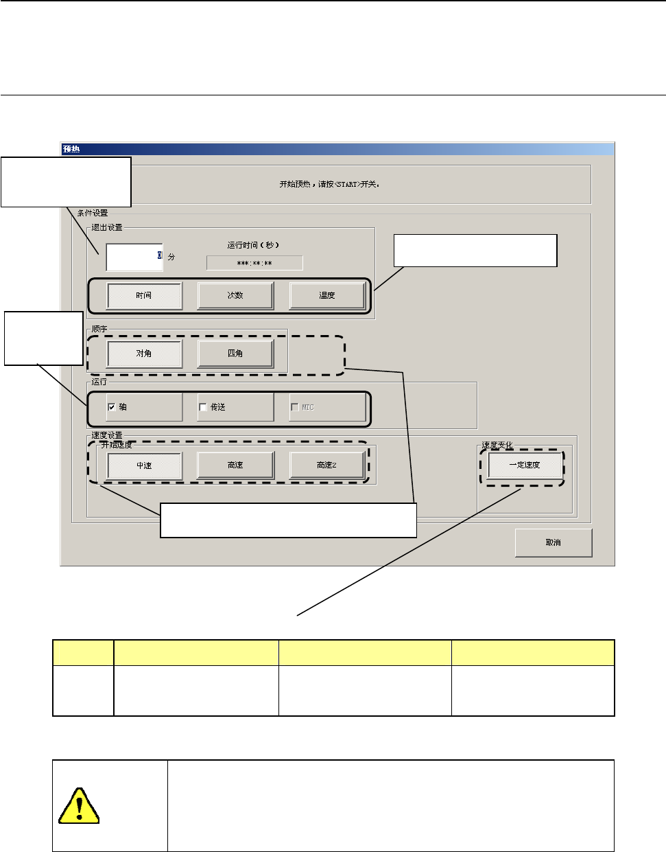 * 在寒冷地区长时间不使用设备的情况下,预热请设置为速度 4。