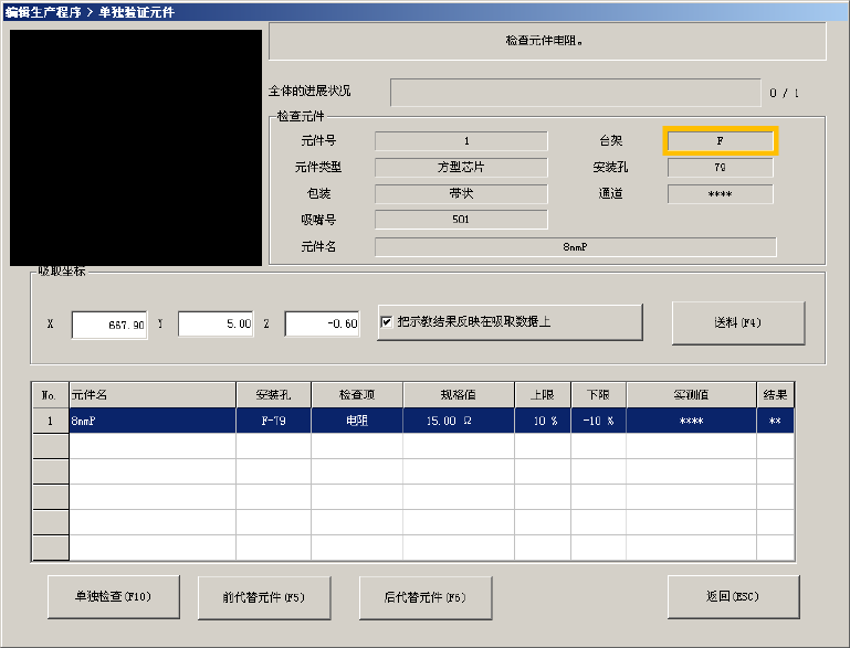 显示当前选中的元件的元件名/安装孔/检查项、规格值、有效值上限、有效值下限、实测值、