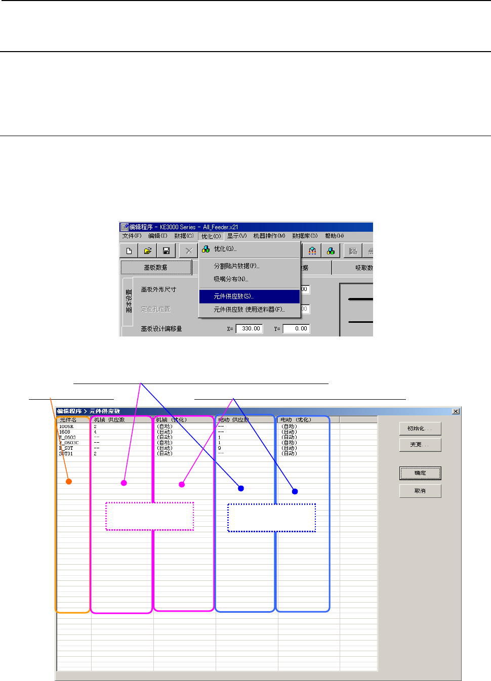 优化是指对用编辑程序制作的生产程序进行「供料器分布的优化」、「吸取贴片顺序的优化」。