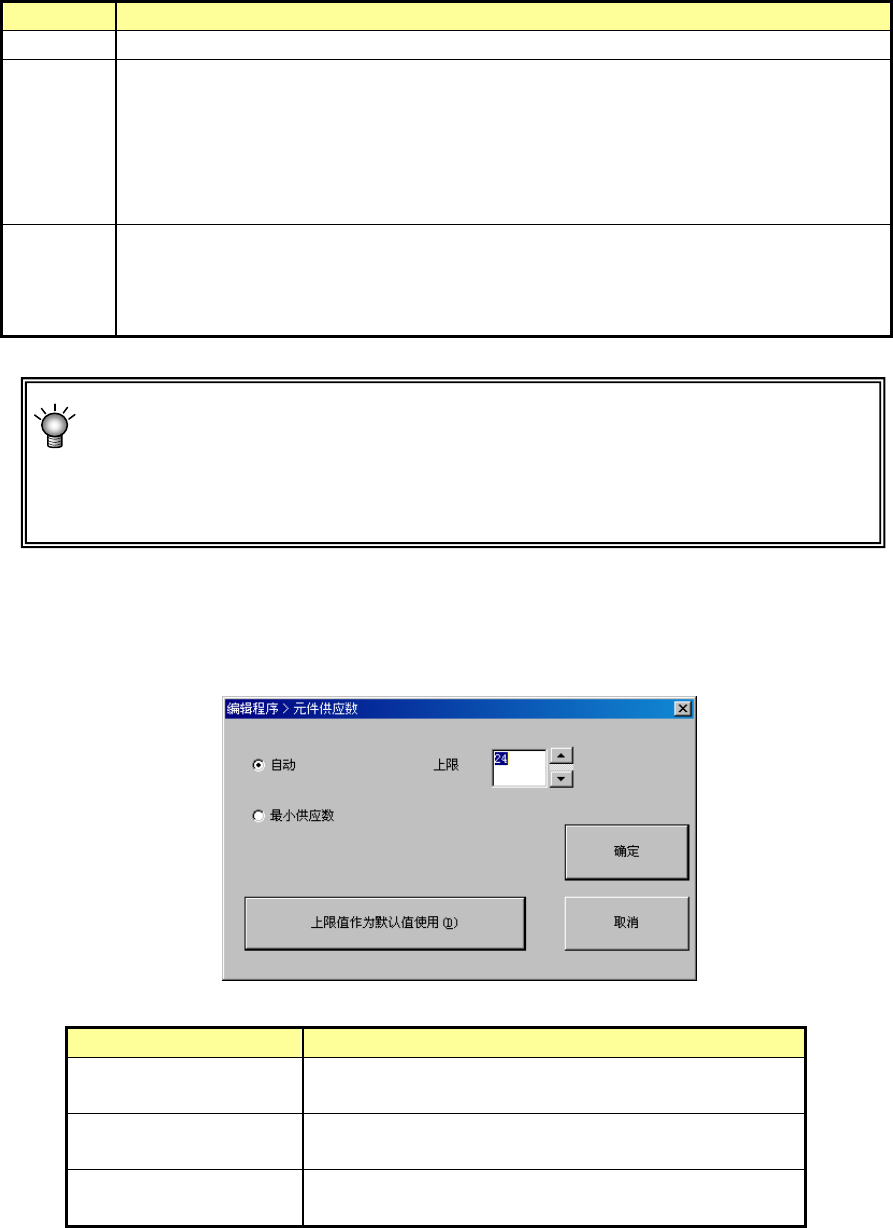 第 1 部 基本篇 第 4 章 制作生产程序 4-132 项目 内 容 元件名 元件数据的元件名 供应数 显示所决定的供应数。 ◆优化后的供应数 :实施(自动)分配优化,分配的结果 ◆手动设置的供应数 : ● 选择「初 始化 / 最小供 应」时,显示在吸取数据中 所制作的供应数。 (在 实施行二重化等情况下,显示多个数) ● 在选择「变更 / 手动」时,显示手动设置的供应数。 (优化) 显示供料器数的设置分配为「自动」还是「手动」中的哪…