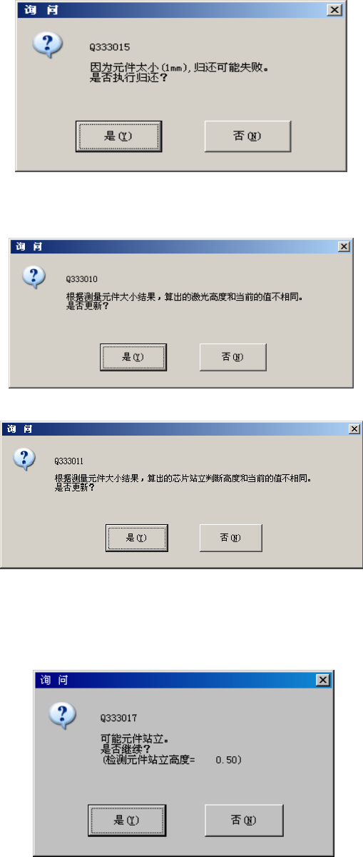 第 1 部 基本篇 第 4 章 制作生产程序 4-220 因元件的包装方式而有所不同,当元件尺寸在 1mm 以下时,会显示询问测量后的元件是归还、或 是废弃信息。 根据尺寸计算出的激光高度或芯片站立判定高度与原来的值不同时,显示如下询问。 · 激光高度覆盖确认 · 芯片站立判定高度覆盖确认 ● 是:用测量的新数据覆盖原来的设置值。 ● 否:忽略新测量值,使用原来的设定值。 检测出芯片站立时,会显示以下提示信息。
