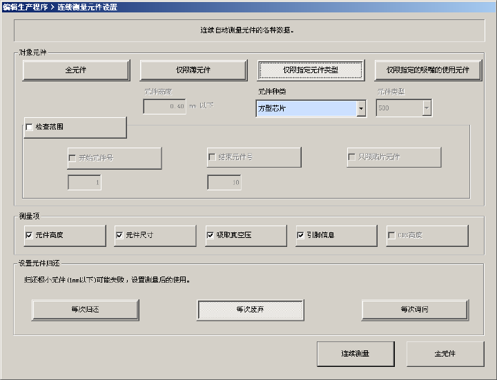 第 1 部 基本篇 第 4 章 制作生产程序 4-224 b) 测量范围 进一步设置被测量元件的条件,锁定为特定编号的元件。 ● 开始元件号:要指定开始测量的元件数据的编号时,勾选此项。 ● 结束元件号:要指定结束测量的元件数据的编号时,勾选此项。 ● 只限贴片元件:仅限定贴片数据中指定的元件数据时,勾选此项。 c) 测量项 选择要测量的项目。默认为选择所有可测量的项目 。根据元件类型,可测量的项目会有所不 同。 d) 设置元件归还 设…