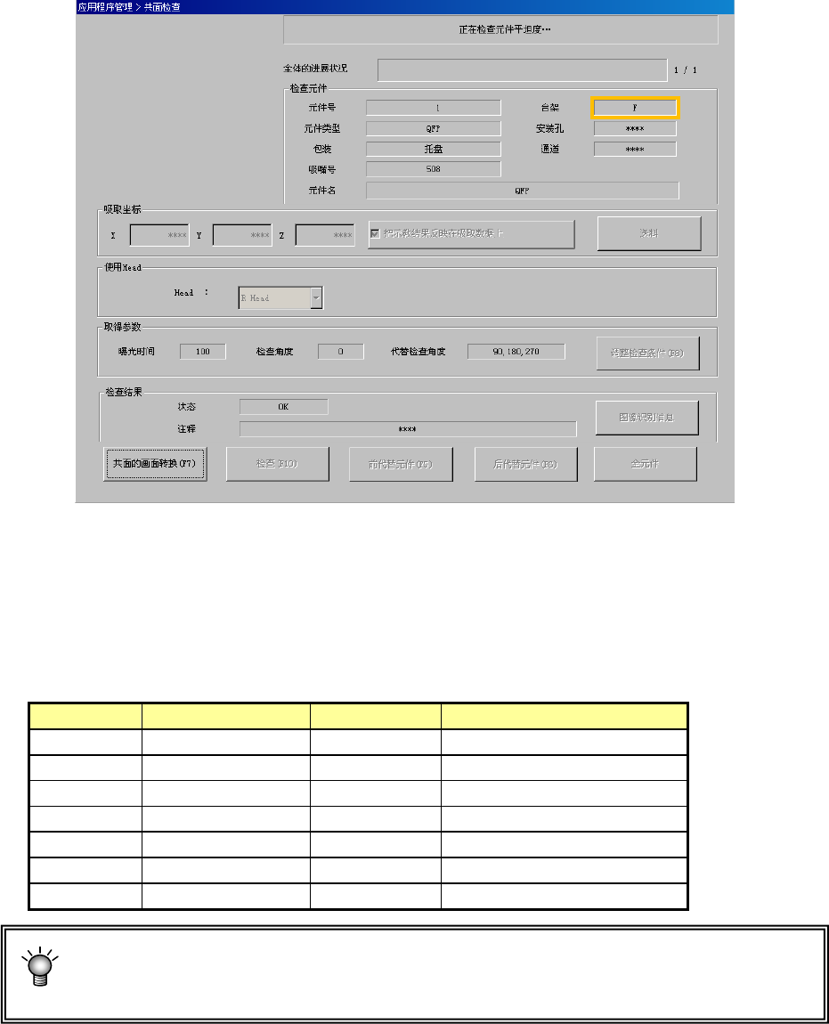 显示正在进行检查的元件内容/吸取位置,逐项显示执行中的处理内容。