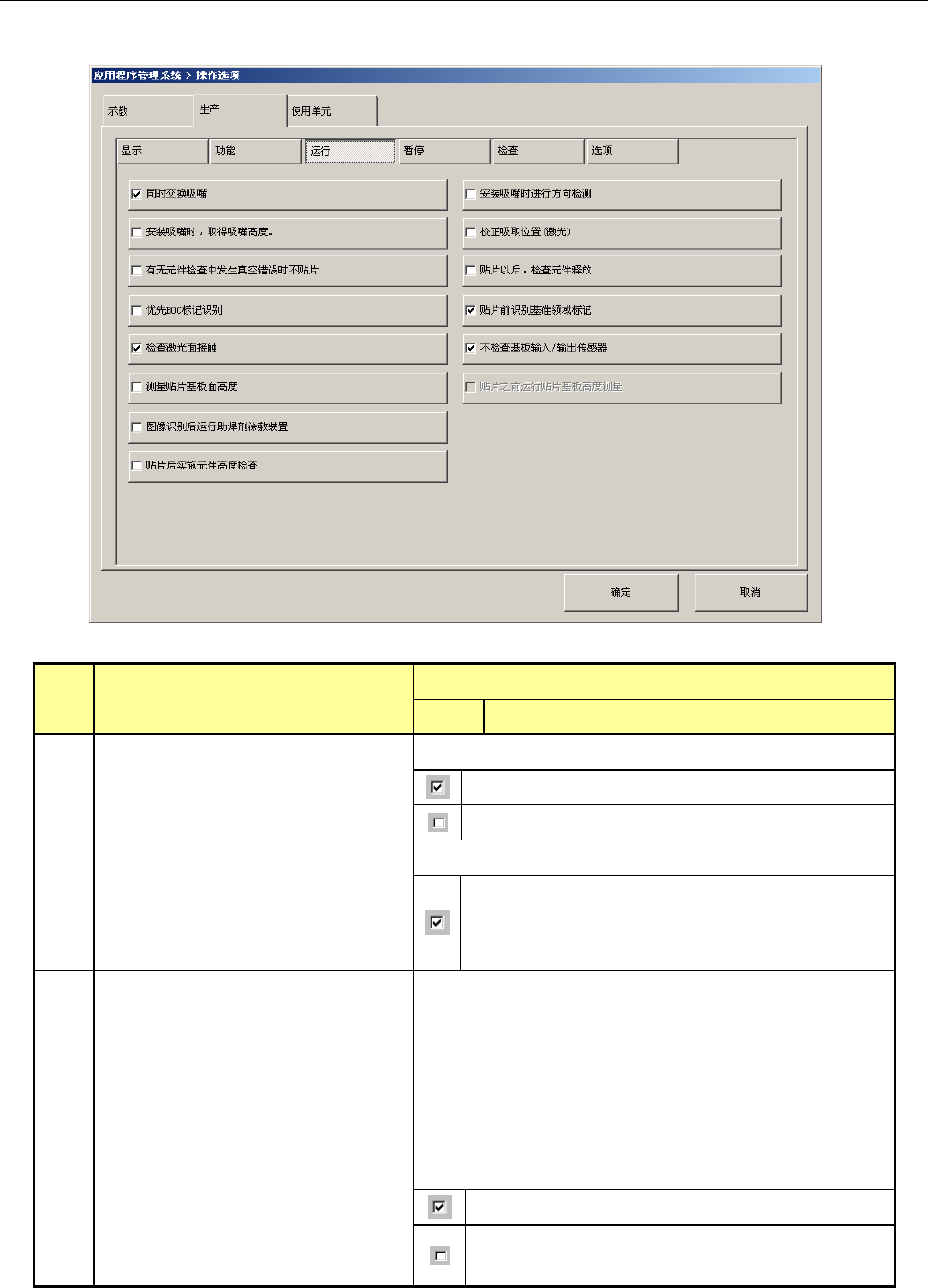 第2部 功能详解篇 第7章 操作选项 7-12 序号 项目 内容 状态 动作及详细内容 4 校正吸取位置(激光) 设置执行吸取位置校正。 根据激光定心的结果,对吸取位置进行校正。 不进行吸取位置的校正。 元件数据的 “ 吸取位置校正 ” 将被忽略。 5 有无元件检查中发生真空错误时 不贴片 对检查有无元件时真空检查判断为 「无元件」 、 激光检查 判断为「有元件」的元件,设置贴片动作。 · 对检查有无元件时真空检查判断为「无元件」 、激…