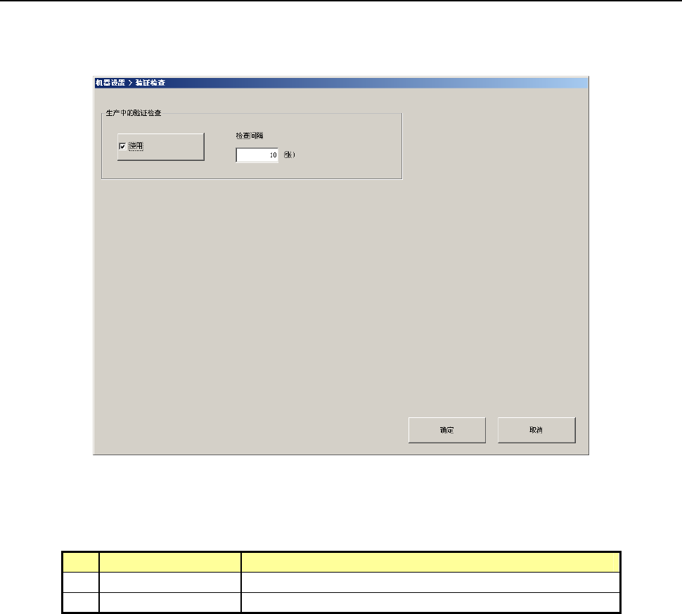 第2部 功能详解篇 第8章 机器设置 8-70 8-4-21 验证检查 选择验证检查后,即显示以下的画面。 进行生产中的验证检查的设置。 (1) 设置项目 No. 设置项目 设置内容 1 使用 对生产中指定的生产基板数量每张进行验证检查。 2 间隔 设置生产中进行间隔验证检查的生产基板数量。