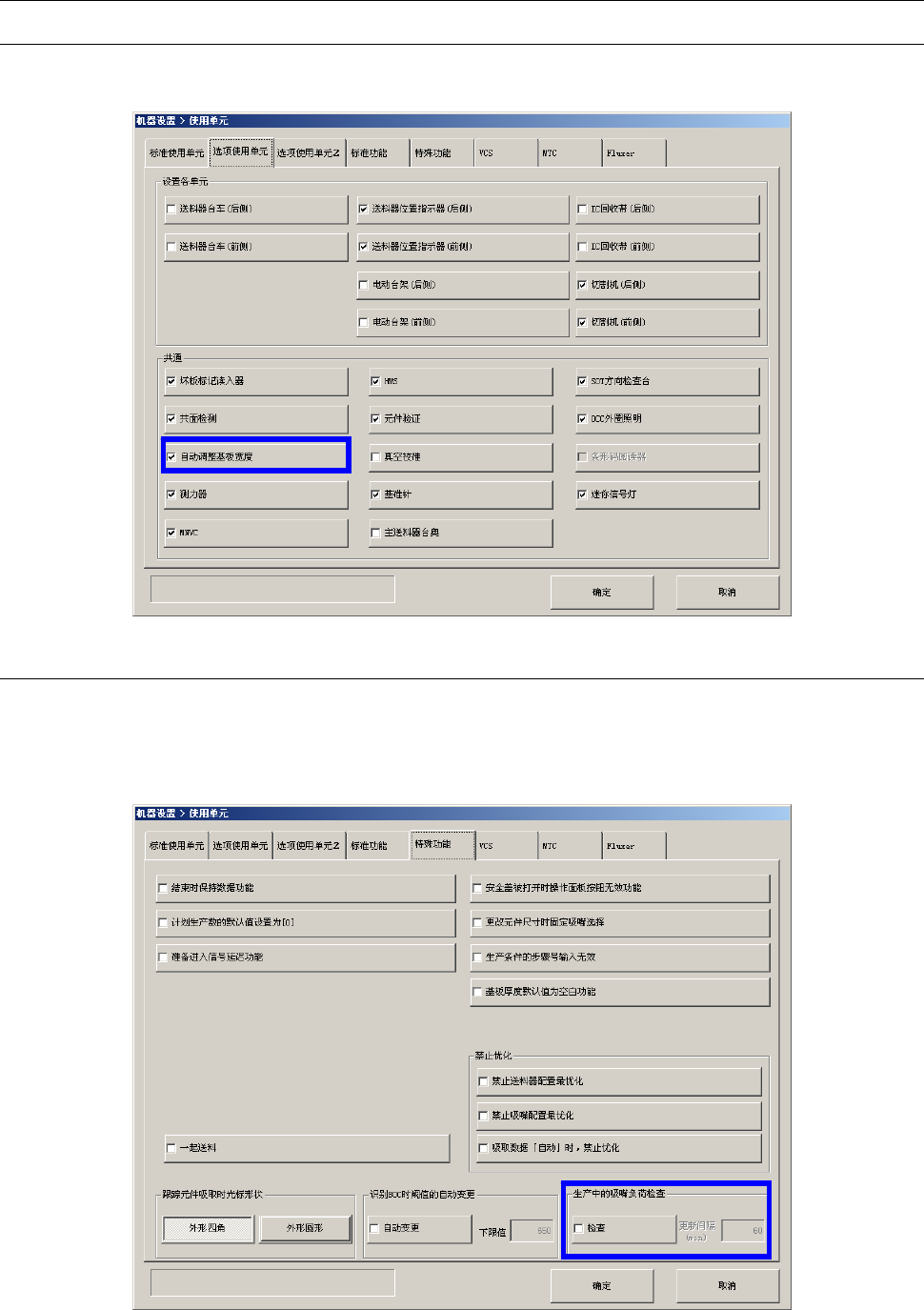 选择设置的[设置组]-[使用单元]中的[使用单元(特殊功能)],使[生产中检查吸嘴负荷]选项有效后,即