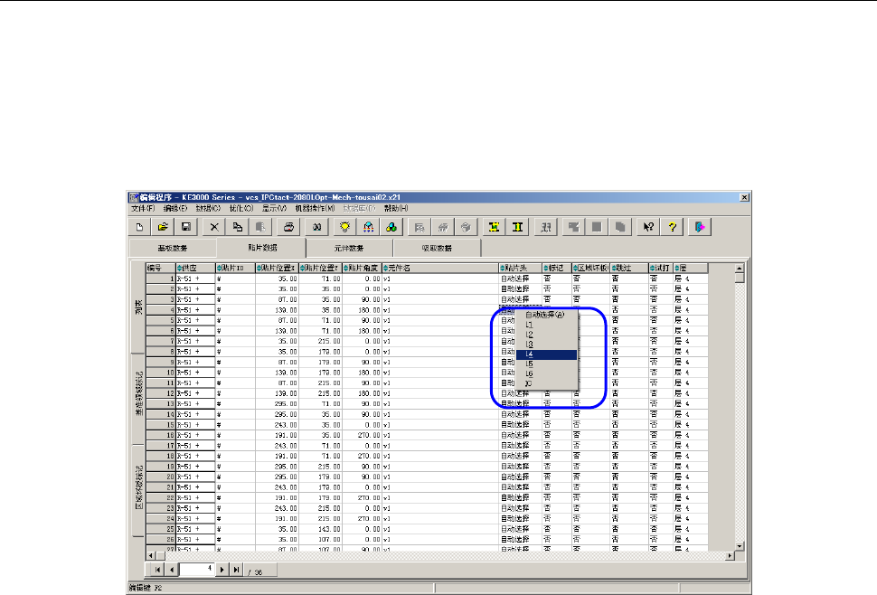 下图为编辑程序的贴装数据编辑画面。选择图像识别元件的贴装点,指定 Head 为 LNC60Head(L1~