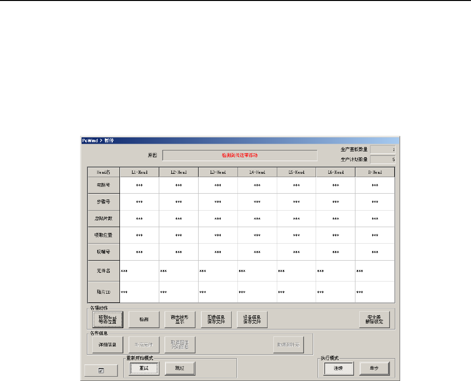 生产中供料器台架下降时,则会暂停生产,显示暂停画面。