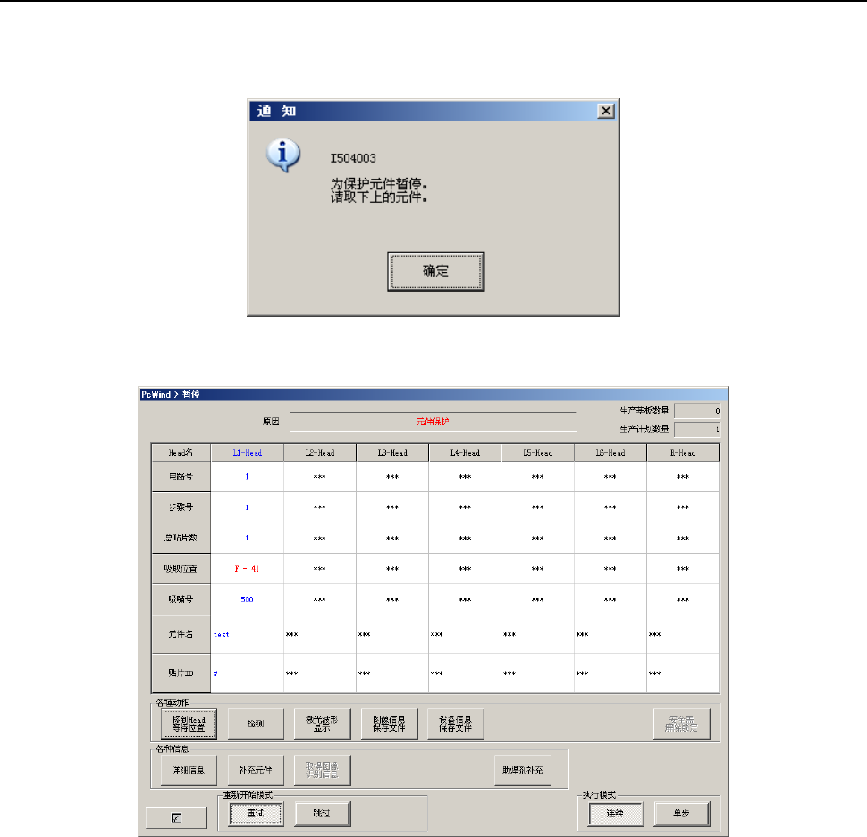 用手取下吸嘴吸取的元件,点击[确定],则会显示暂停画面。