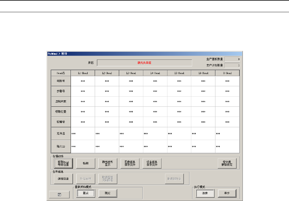当暂停的原因为激光头弄脏错误、芯片站立错误、激光识别错误、异元件错误时,暂停画面上会显示