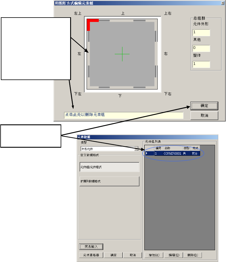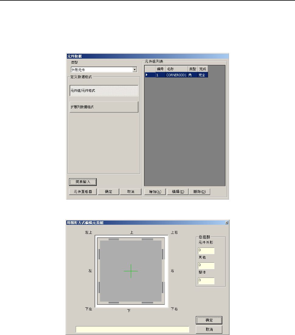 第2部 功能详解篇 第6章 通用图像元件 6-27 6-4-4 外形元件类的制作方法 进行外形元件类(仅“角”、“边”的元件)的简易输入。 其条件为∶所有的元件组必须都位于角上或边上,且元件组的最大数目为“4”。 (1) 起动「用图表来编辑外形元件组」画面 ① 在元件数据画面中选择“外形元件类”,并选择“简易输入”。 ② 显示「用图形方式编辑元素组」画面。