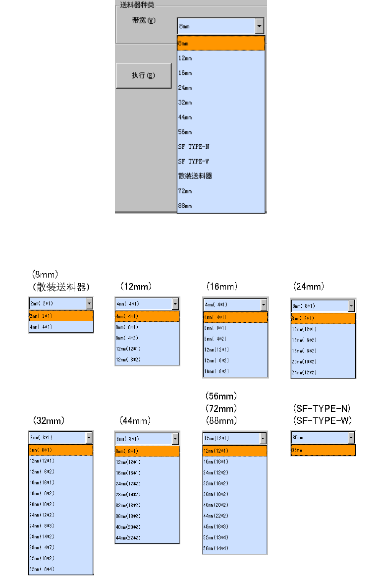 单击组合框、或在光标对准组合框的状态下,按 [Alt ]+ [↓]键选择供料器类型。在控制项目中设