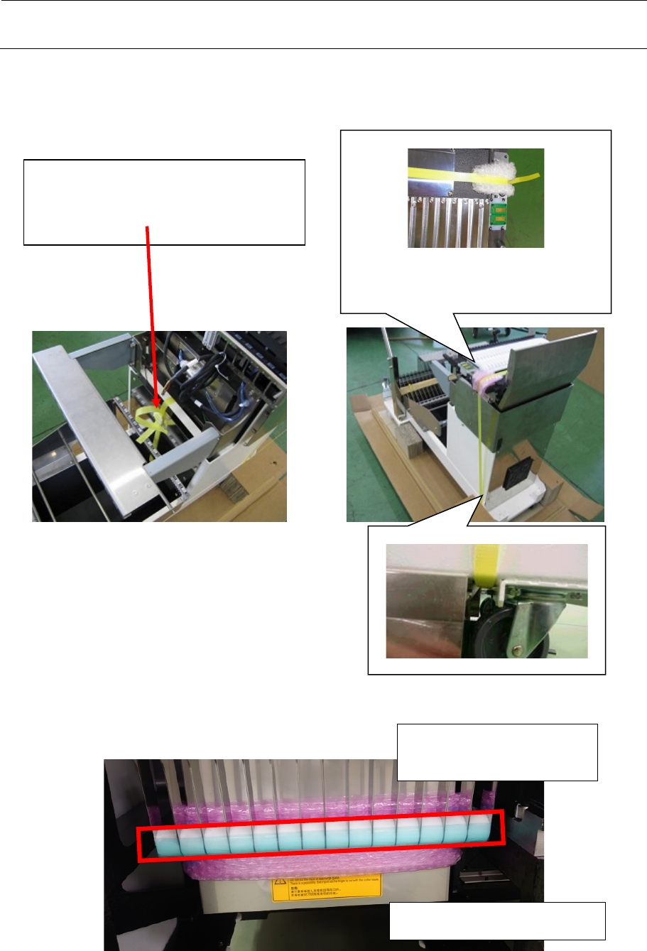 包装要领书 13 2. 用纤维丝胶带将卷盘支架固定在调节杆上。 用纤维丝胶带固定卷盘支架 分离板固定部位 请用气泡包装膜将分离板集中包 裹,固定到废料箱内。固定位置 是靠近身前一侧。 40084676 :分离板× 13 块
