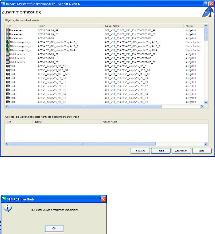 Abbildung 3-25: Fertigstellung beim Import von XML-Dateien für Tische unter SIPLACE Pro