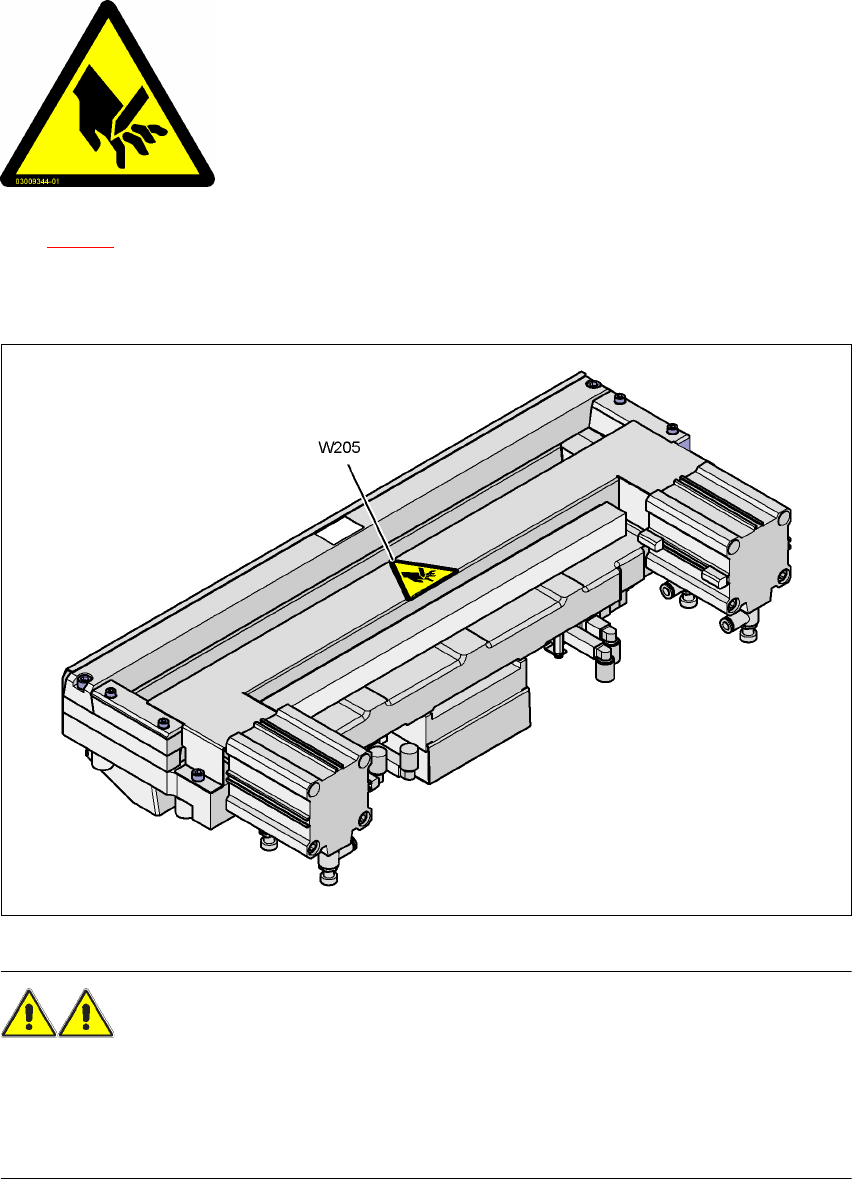 사용자 매뉴얼 SIPLACE HF 시리즈 2 작동상의 안전사항 소프트웨어 버전 SR.505.xx 2004 년 7 월 미국판 2.2 경고 레이블 39 2.2.3.2 하단에 있는 경고 레이블 W205 2 그림 2.2 - 5 테이프 커터 하단에 있는 경고 레이블 W205 2.2.3.3 테이프 슈트에 있는 경고 레이블 W205 2 그림 2.2 - 6 폐기 테이프 슈트에 있는 경고 레이블 W205