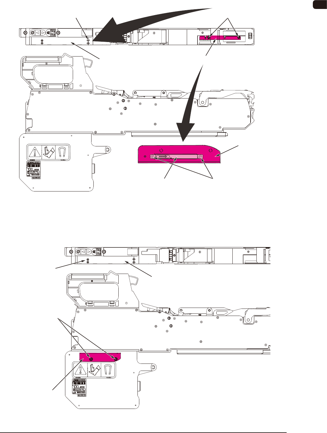 OM-1605 2-22 2. テープの取付けおよび取外し方法 • 56mm 幅テープ使用時 手順 (1) 精密ドライバで固定ネジ ( なべ小ネジ ) を緩めて、補助サプレッサ を取外し、補助サプレッサ収納部に取付ける。 補助サプレッサ収納部 収納 補助サプレッサ 補助サプレッサ 固定ネジ (なべ小ネジ) 固定ネジ (なべ小ネジ) FB28 (2) 固定ネジ ( なべ小ネジ ) を緩めて、部品転落防止カバーを取外す。 部品転落防止カバ…
