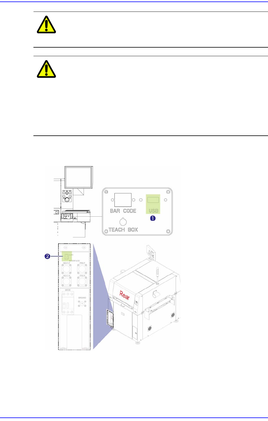 7-8 Samsung Screen Printer SP1 Introduction 7.1.5. 气压的设定与电缆的连接 1. 把气压连接到 Air Main Inlet 侧。 此时、 需要检查设备安装 现场的 Air Main 连接部 上是否安装了 Air Filter 与 Mist Separator Filter( 气压不足时、 Signal Light 亮黄灯 ) 。 1: 黄灯亮灯 2: 左侧 Fitting 2. 旋转 …
