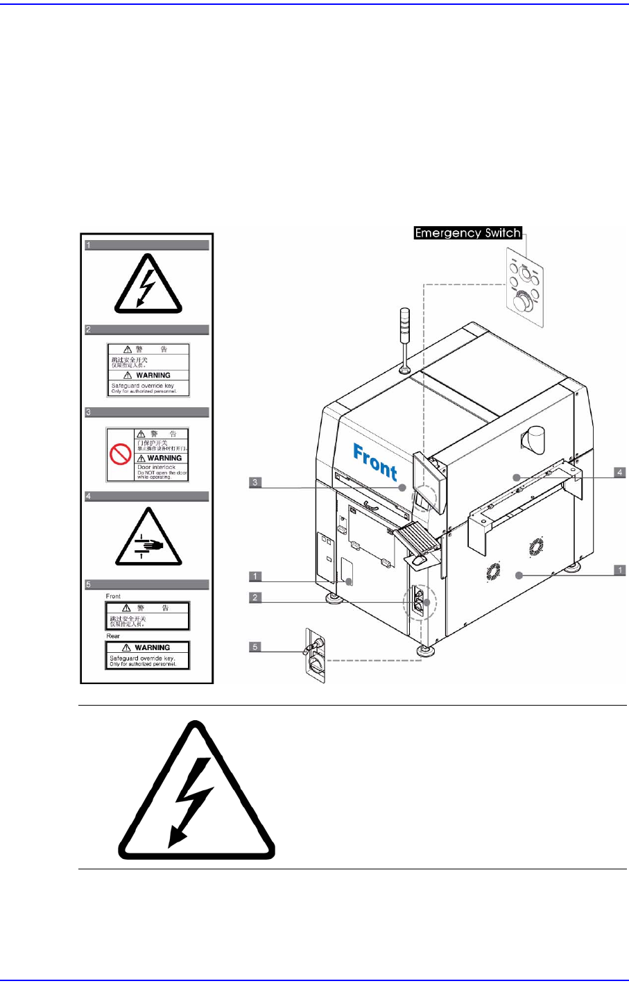 前言 iii 安全注意事項 (Safety Precaution) 以下各节的标签贴在指定的位 置上。 为了安全使用设备请遵守各标签 的指示事项。 标签脱落或损伤时请参考相应 图解在指定的位置上粘贴新标签。 有关 标签订购或改 善及建议事项请咨询本公司的 CS 公司 (STS) 或当地代 理店。 设备前面 设备前面贴有以下标签 图 1.1 设备前面贴有以下标签 盖内侧及周围连接物部位存在高电 压要注意 电击危险。 在维护和修理设备操…