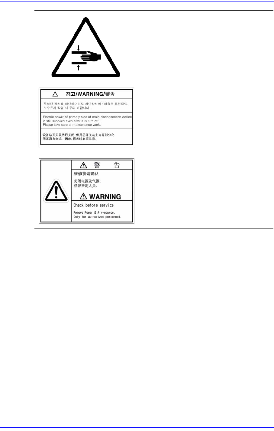 前言 v  设备后面 设备后面贴有以下标签 图 1.2 设备后面的安全标签 盖内侧及周围连接物部位存在高电 压要注意 电击危险。 在维护和修理设备操作时一定要先 切断主电 源。 运行中请勿打开门 贴有此标签处有移动体、 驱动中打开门 把身 体的一部份伸进设备内部时非常危 险。