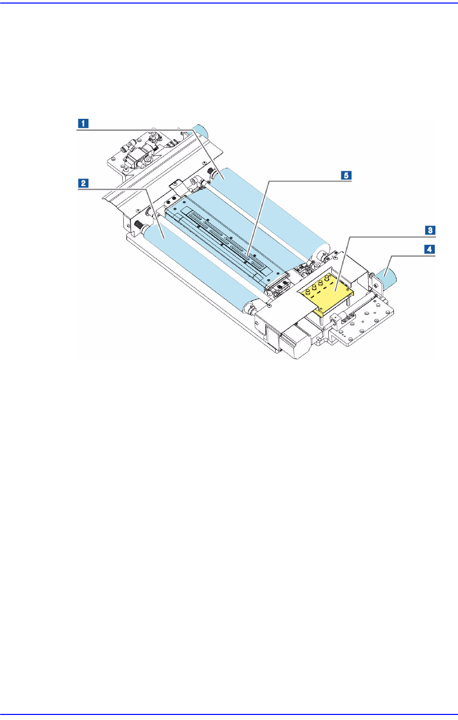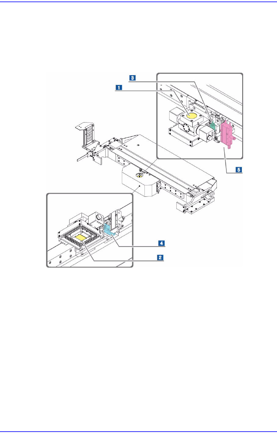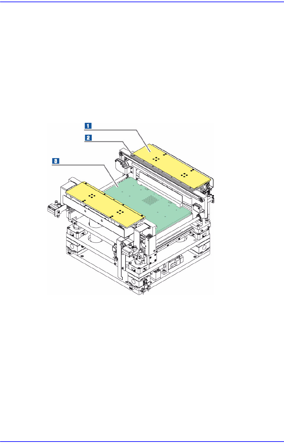 前言 xvii  视觉拱架 可以让搬入工作台的 PCB 停止在指定位置、 识别 PCB 与掩模的基准标志而得以 补偿 PCB 与掩模的中心之间的差异。 而且、 和清洗器模组接驳后可以辅助清 洗器对掩模的清洗作业。 视觉拱架上配置了可以测量 PCB 温 度的传感器。 1: 基准上相机 (Fid UpCam1) 2: 基准下相机 (Fid DnCam2) 3: PCB 温度量测传感器 4: PCB 感应传感器 5: PCB 止挡器  基…