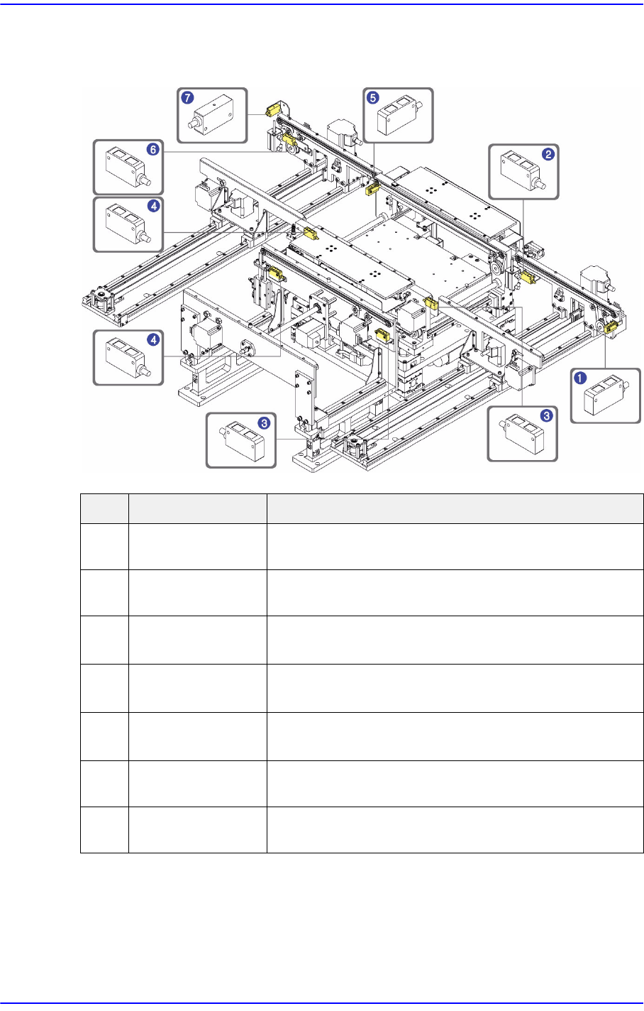 5-2 Samsung Screen Printer SP1 Introduction 5.2. 基板检测传感器 在输送带的 PCB 搬入 / 搬 出路径上安装了 9 个 PCB 感应传感器。 No. 名称 功能 1 PCB 入口缓冲右侧 传感器 可以检测出 PCB 从上一个工序搬入本 设备。 2 PCB 入口缓冲左侧 传感器 可以检测出 PCB 正常搬入 EntryS tation(ST -Gate1) 的 作业完毕与否。 3 工作台…