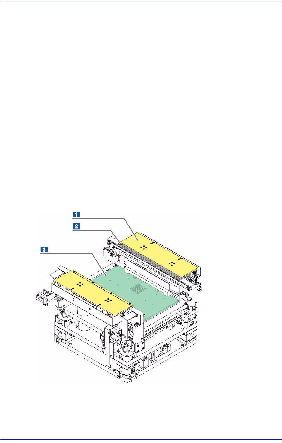 PCB进入工作台后、受到止挡器的阻挡而停止在指定位置。然后上端支撑台上升并