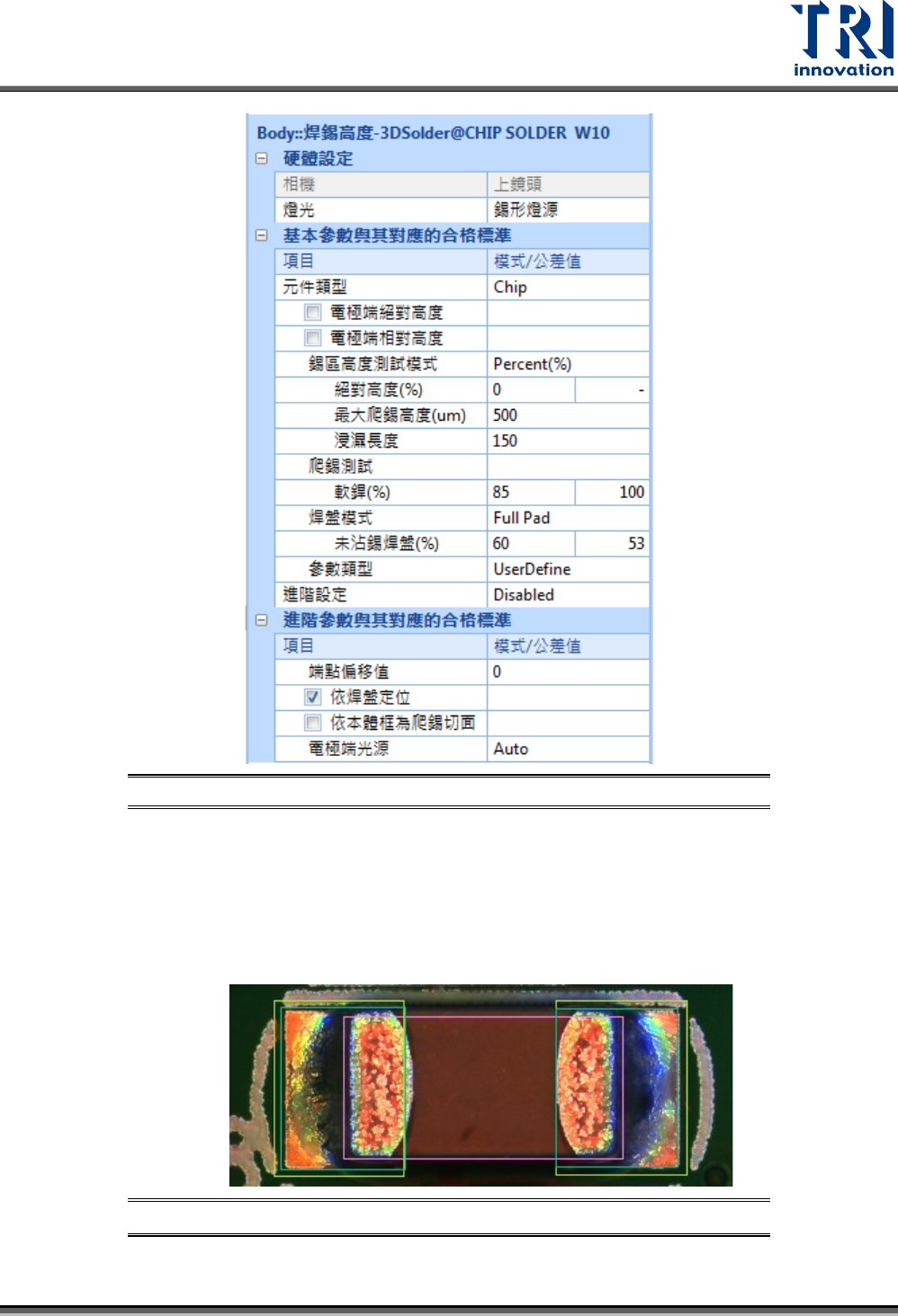 Test Research, Inc. TR7700Q E User Gu ide – S o f twar e 84 圖 133 : 3Dsold er 框參數設定畫面 硬體設定 相機:顯示目前檢測框 所在的相機位置。 燈光:僅能在錫形燈源 。 基本參數與其對應的合格 標準 元件類型:選擇 Chip 、 Lead 或者 Hidden Lead 。 (Lead 和 Hidden Lead 模式下須套用 Pin 框 )…