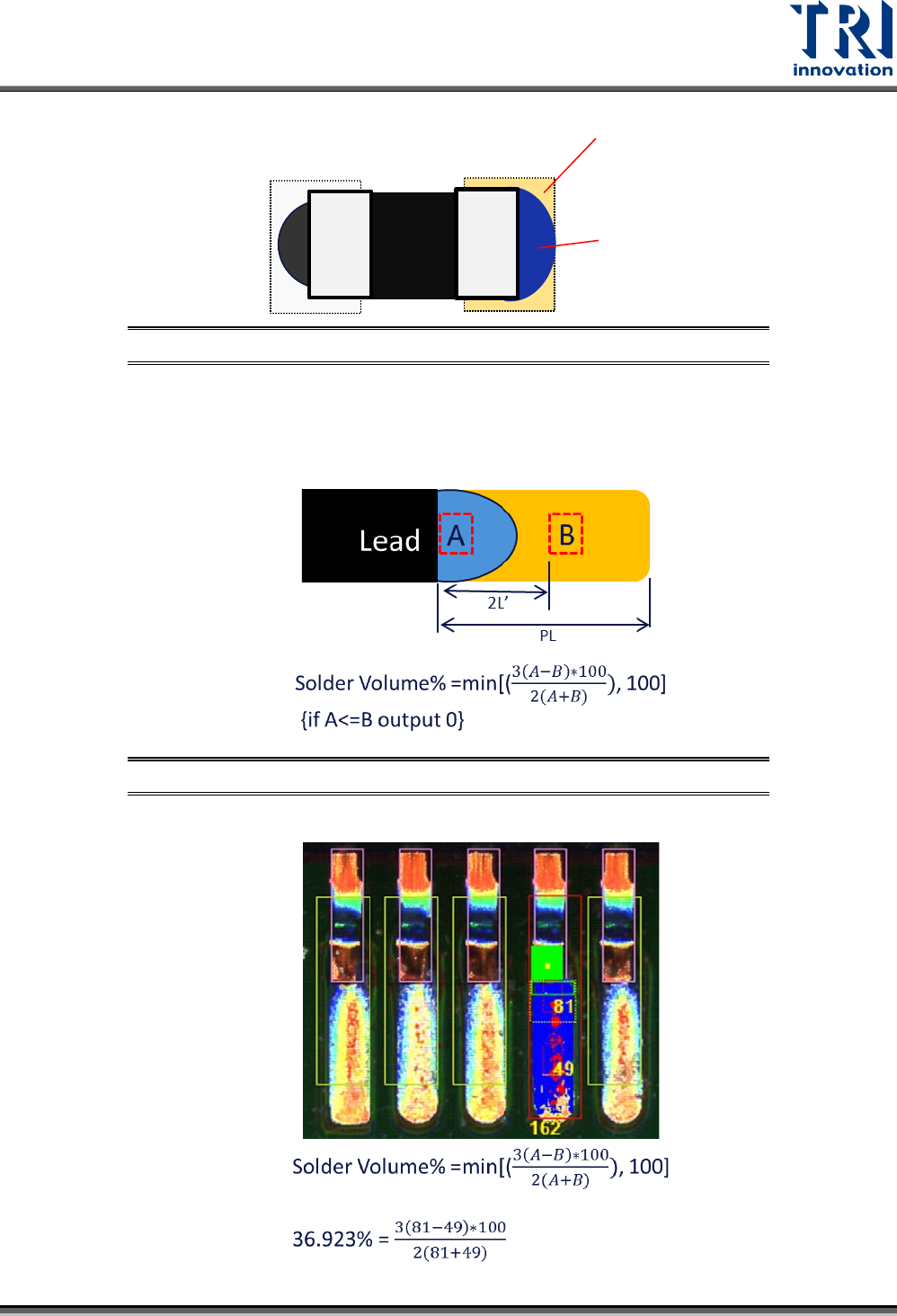 – 焊錫體積:將錫區分為兩部分,並比較兩個區域的體積差異來評估是否有積錫狀態。