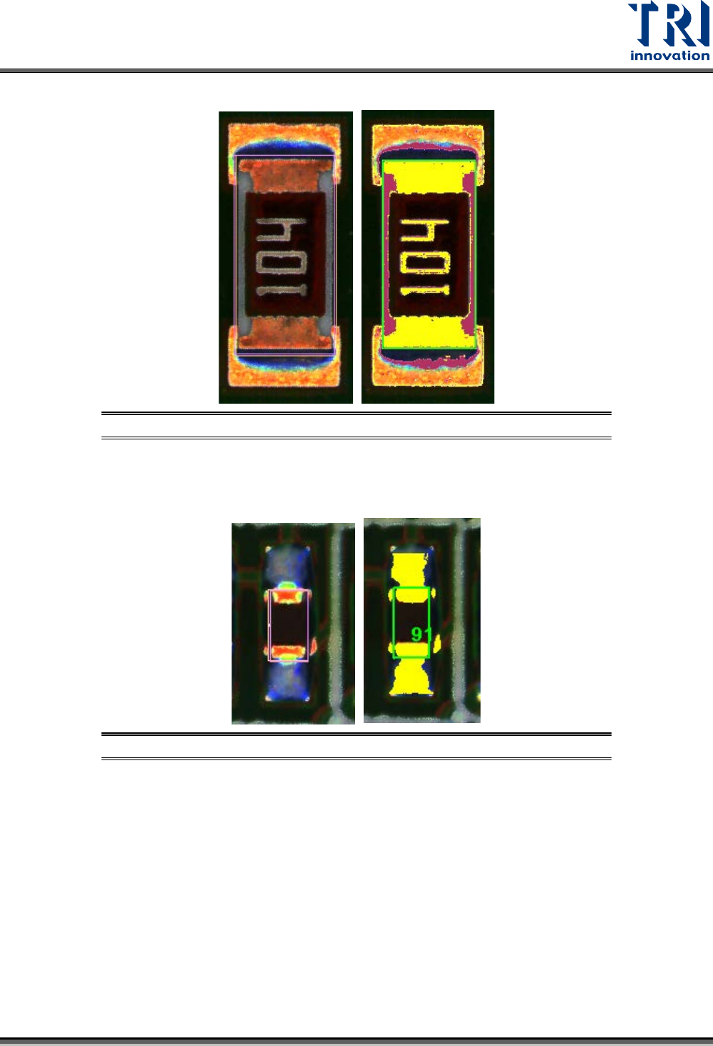 Test Research, Inc. TR7700Q E User Gu ide – S o f twar e 95 圖 153 :本體檢測框 – Body 模式色彩選取方式 − Square :當本體為黑色 元件時使用,並適用於 長方形或正方形元 件。擷取色彩時須 盡 量不要讓雜訊與本體相 連,如下圖所示。 圖 154 :本體檢測框 – Squa re 模式色彩選取方 式 − Rnet :利用 Rn et 的 body 兩旁有明顯的…