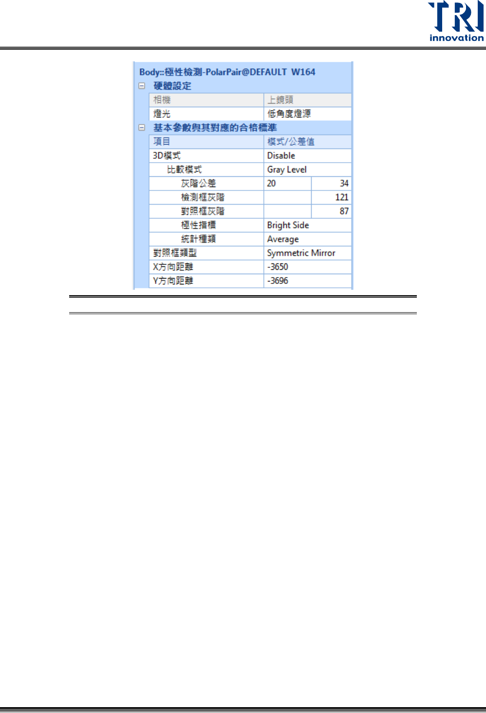 極性比對:勾選表示開啟極性檢測功能。即待測物影像若旋轉 180 度時會視為不良。