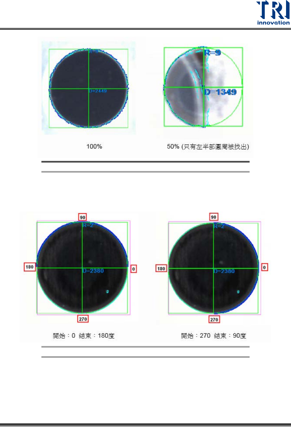 Test Research, Inc. TR7700Q E User Gu ide – S o f twar e 137 圖 224 :偵測橢圓 – N orma l 範例 圖 225 :偵測橢圓 – Playground 範例 確認圓周:檢測圓周的 完整度。 − 比例 (% ) :設定完整度的比例下限 。