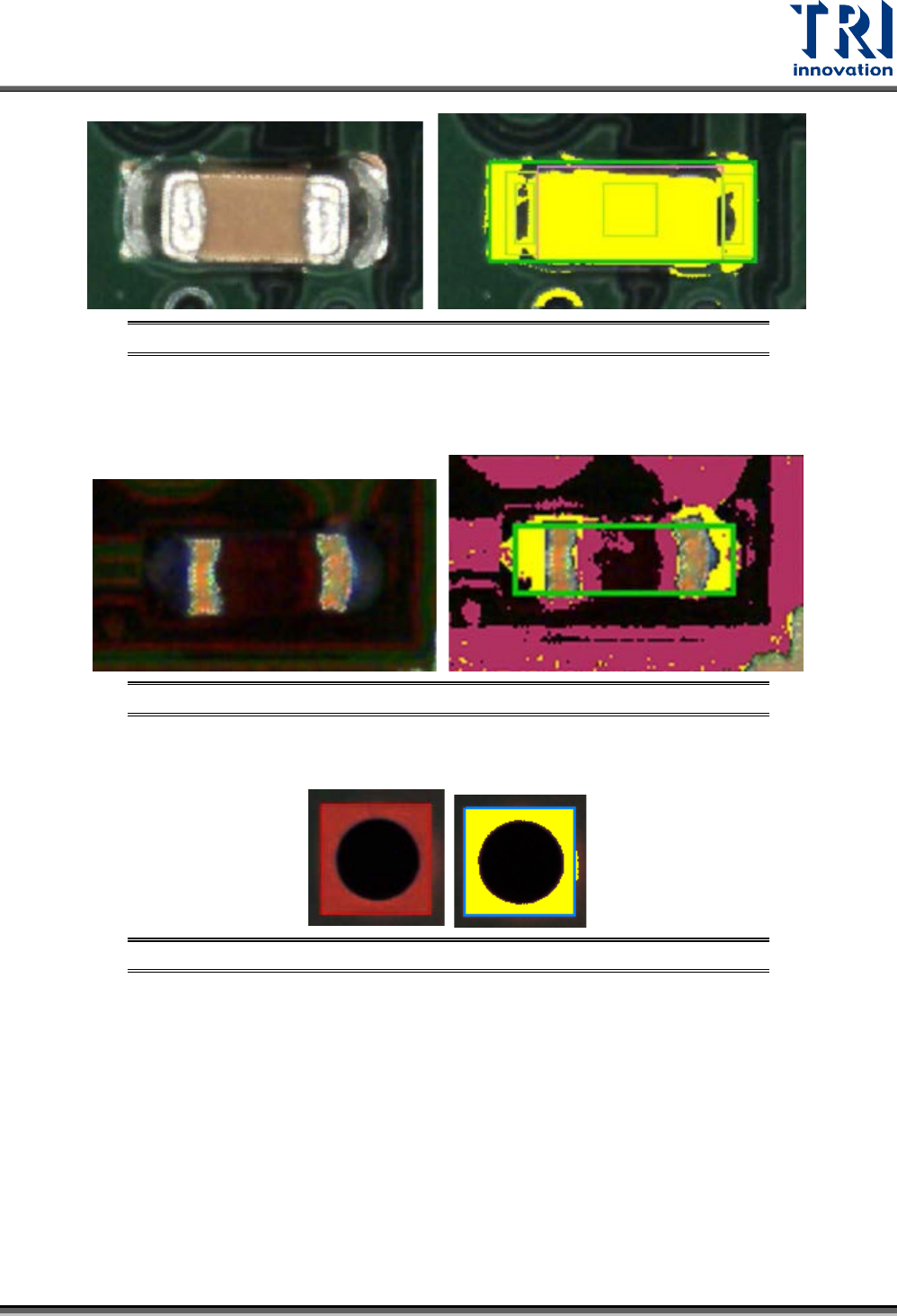 Test Research, Inc. TR7700Q E User Gu ide – S o f twar e 161 圖 262 :焊盤定位 框 – Hea d 模式使用情況 2. Solder :一般適用於小顆 的晶片元件,有較短的 焊盤,且無明顯的 焊盤亮區可供定位 時。 建議使用方式:調整色 彩至可以清楚的選 擇爬錫端的暗藍色 色彩。 圖 263 :焊盤定位框 – Solder 模式使用情況 3. Body :一般適用於長…