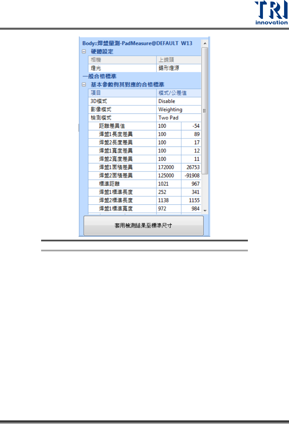 套用檢測結果至標準尺寸:將計算出來的焊盤大小結果設為標準值。