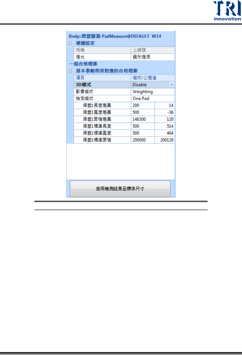 套用檢測結果至標準尺寸:將計算出來的焊盤大小結果設為標準值。