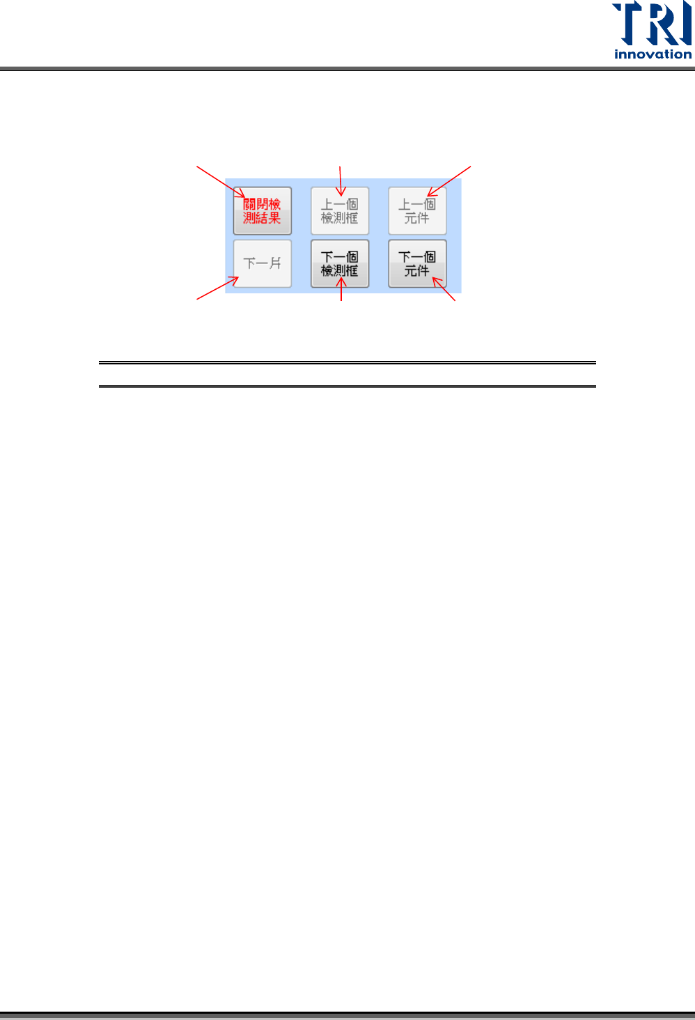 Test Research, Inc. TR7700Q E User Gu ide – S o f twar e 178 使用者也可以使用不良 影像操作區來進行 微調時切換檢測框 的動作,功能說 明如下。 圖 283 : 微調 操作區說明 切換到下一片檢 測板 切換到上一個元件 的檢測框 切換到下一個元件的 檢測框 離開檢測結果視 窗,回到主畫面 切換到上一個 檢測框 切換到下一個 檢測框