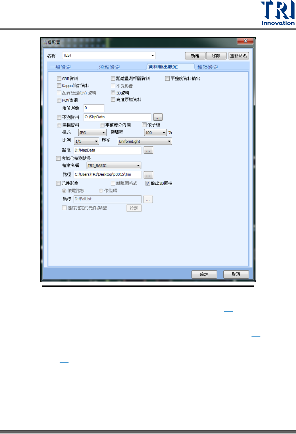 Test Research, Inc. TR7700Q E User Gu ide – S o f twar e 189 圖 295 :流程架構 設定視窗 – 資料輸出設 定 GRR 資料:開啟收集 GRR 資料功能。詳細操作 功能請參閱 6.3 。 距離量測相關資 料:輸出量測的距 離資料給維修站 使用。 平整度資料輸出 :輸出平整度高度 相關資料,詳細 請參閱 平整度 量測說明文件 。 KAPPA 統計資料:開啟 收…