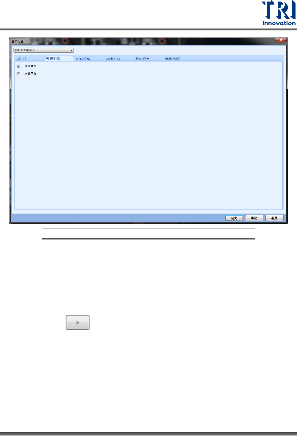 Test Research, Inc. TR7700Q E User Gu ide – S o f twar e 193 圖 300 :產品配置 視窗 – 報廢 子板 壞板標記:開啟壞板標 記的檢測功能。 全部不良:當檢測板上 全部的壞板標記都 符合時才會判定此 子板為報廢。 測試管理 此功能主要的目的是僅測試 專案 裡被 選擇的項目, 而其他沒選擇的項目將 不進行測試, 以節省檢測時間並專注 於微調所選擇的項 目。 使…