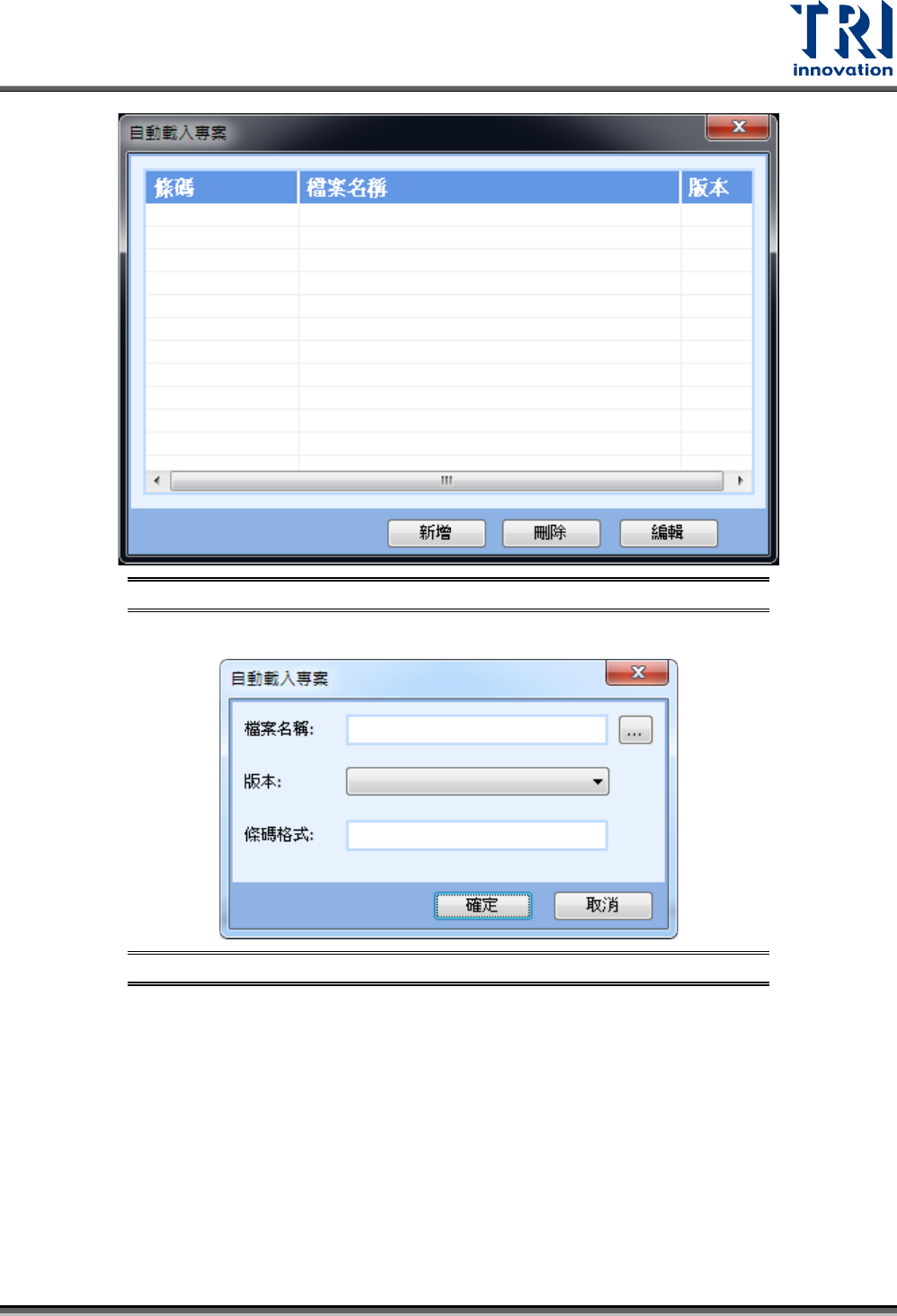 Test Research, Inc. TR7700Q E User Gu ide – S o f twar e 215 圖 335 :自動載入 專案 – 步驟 2 步驟 3. 選擇 [ 工具 ] > [ 自動載入專 案 ] 。 步驟 4. 點選 [ 新增 ] ,並選擇檔案 路徑,選擇版本以及設 定條碼格式後,按 下 [ 確定 ] 完成設定。 圖 336 :自動載入 專案 – 步驟 4
