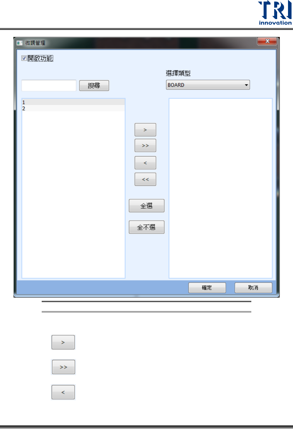 :將左方清單(搜尋清單)中選擇的項目新增到右方清單(檢測清單)。