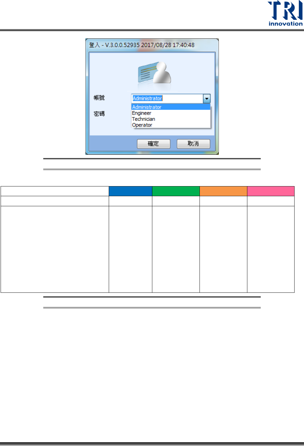除了管理者(Administrator)帳號外,系統還提供工程師(Engineer)、技術人員(Technician)與操作